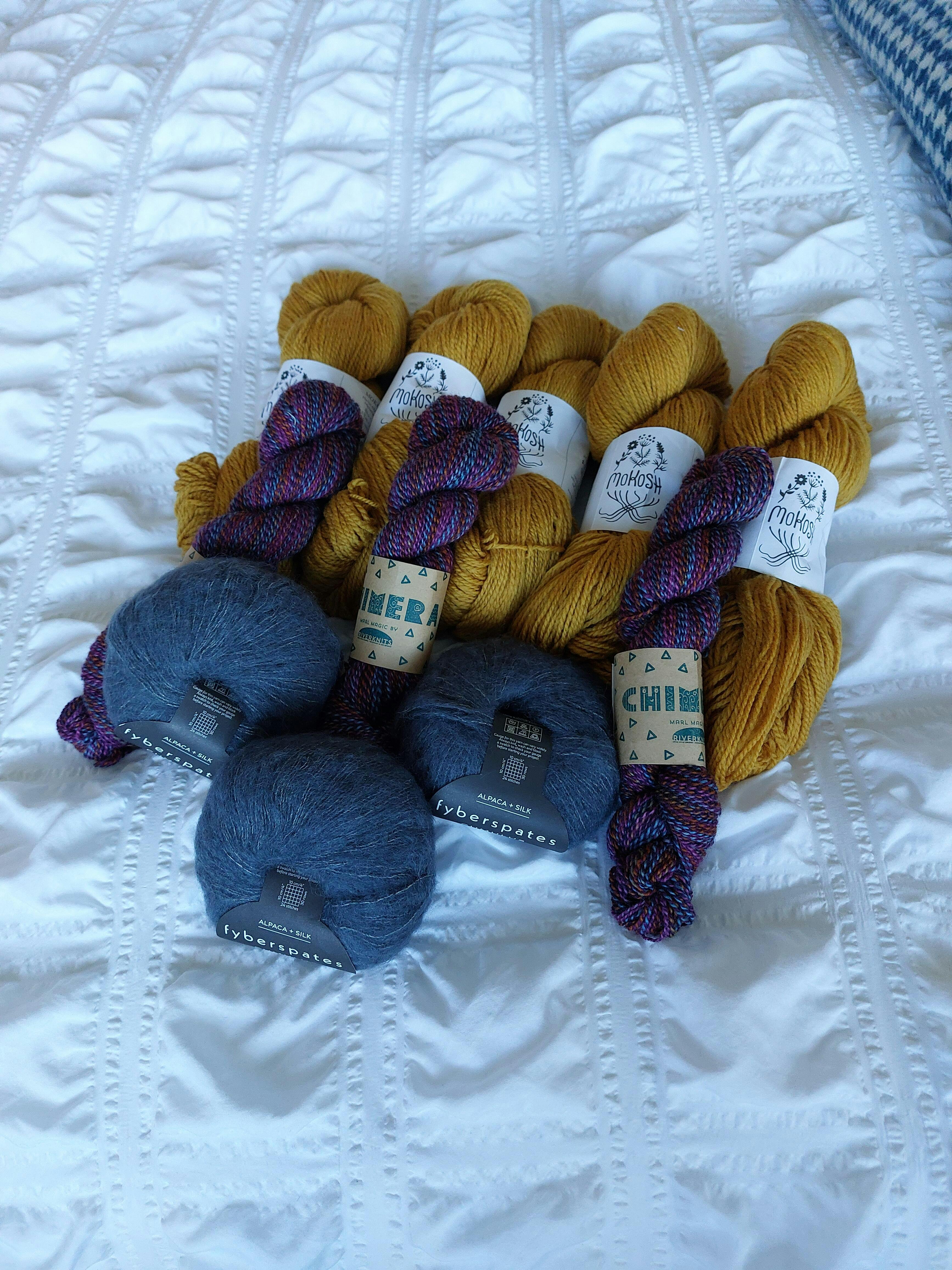 We are drooling over the potential possibilities in combining the gorgeous Merino d'Arles Mokosh from Hey Mama Wolf (Yarn A), the magical hand-dyed marl, entirely unique to RiverKnits, Chimera (Yarn B) and the glorious, voluptuous Fyberspates Cumulus as our fuzzy fix (Yarn C).