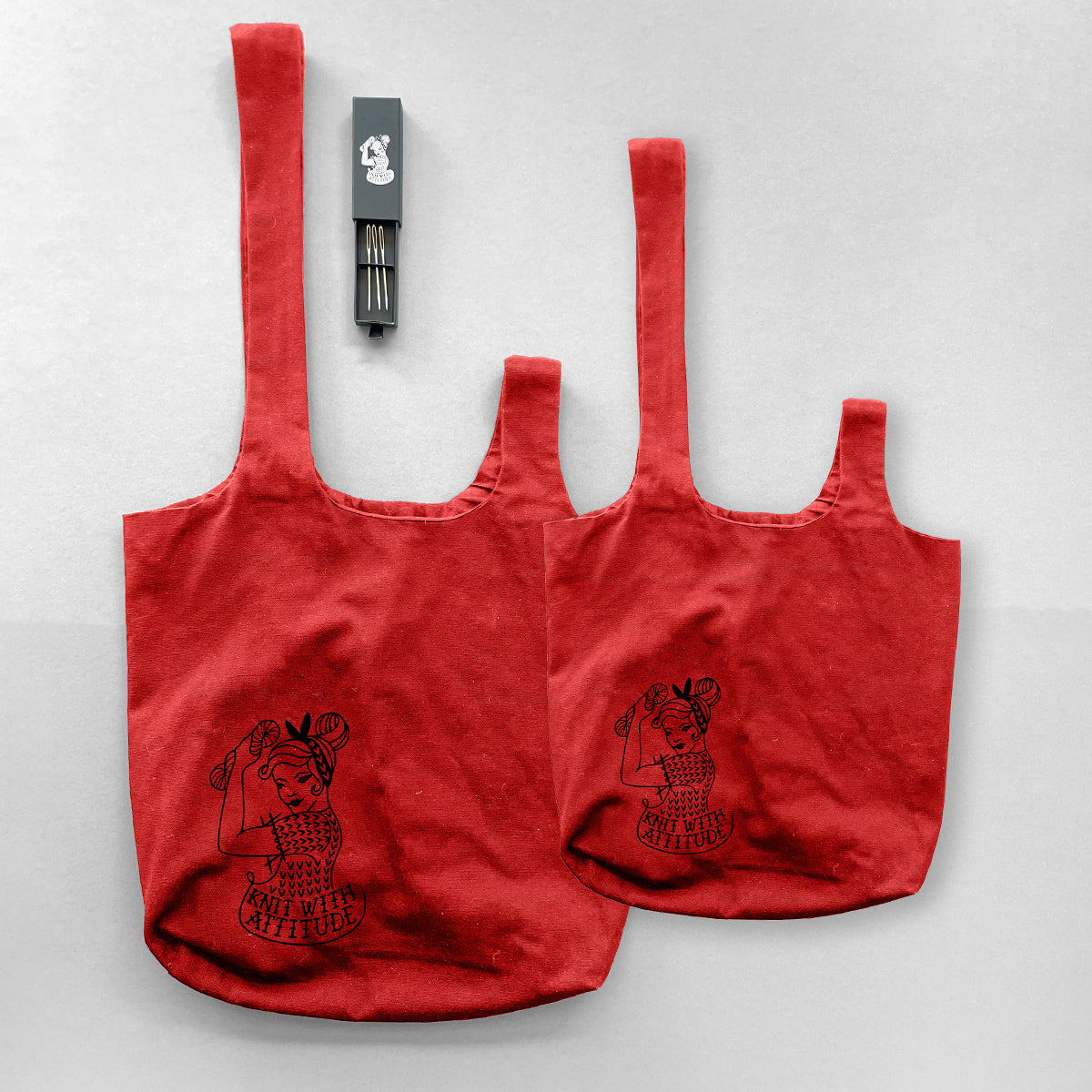 Both KWA Small Tote Bag Limited Edition London Red and the KWA Large Tote Bag Limited Edition London Red are just beyond cool, first of all despite the names, both are actually quite huge (the picture does not give justice to size), second of all they have these super practical knot-style straps in two different lengths for easy carrying, third of all could they even be more of a statement!!! Made especially for us in double layered sturdy 11oz cotton canvas featuring our Knit With Attitude logo. For individual product details read more about the small tote HERE and our large one HERE!